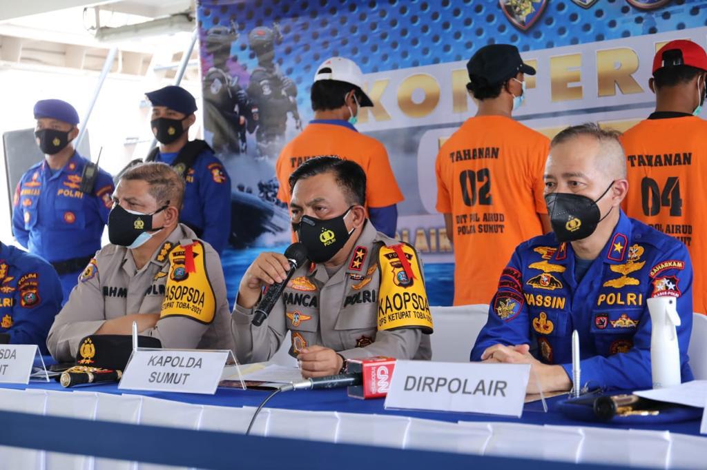 BELAWAN (XNews.id) – Kapolda Sumut Irjen Pol RZ Panca Putra Simanjuntak bersama Dirpolair Korpolairud Baharkam Polri Brigjen Pol Yassin Kosasih, memimpin press rilis penangkapan kapal ikan asing di Selat Malaka.