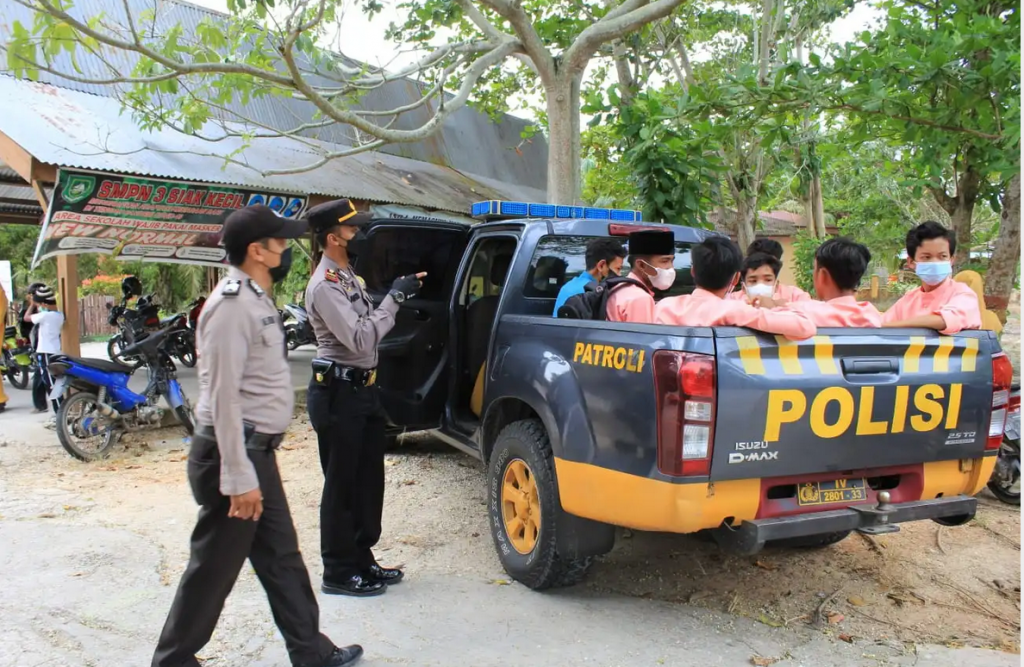 Terlihat bahwa Kapolsek Ipda Alfan bersama anggota dan pihak yang membantu menggunakan kendaraan Polsek Siak Kecil untuk sampai ke pelosok-pelosok desa, sekolah dan rumah warga.